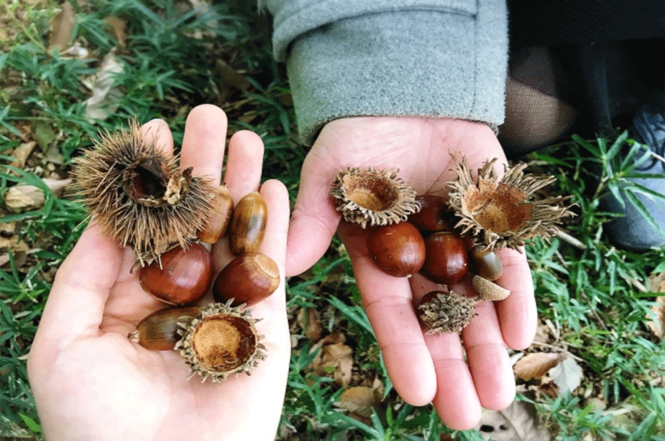 紙袋や籠を持参して、どんぐりが落ちている公園で「1分間でどれだけ拾えるか」を競うゲーム。