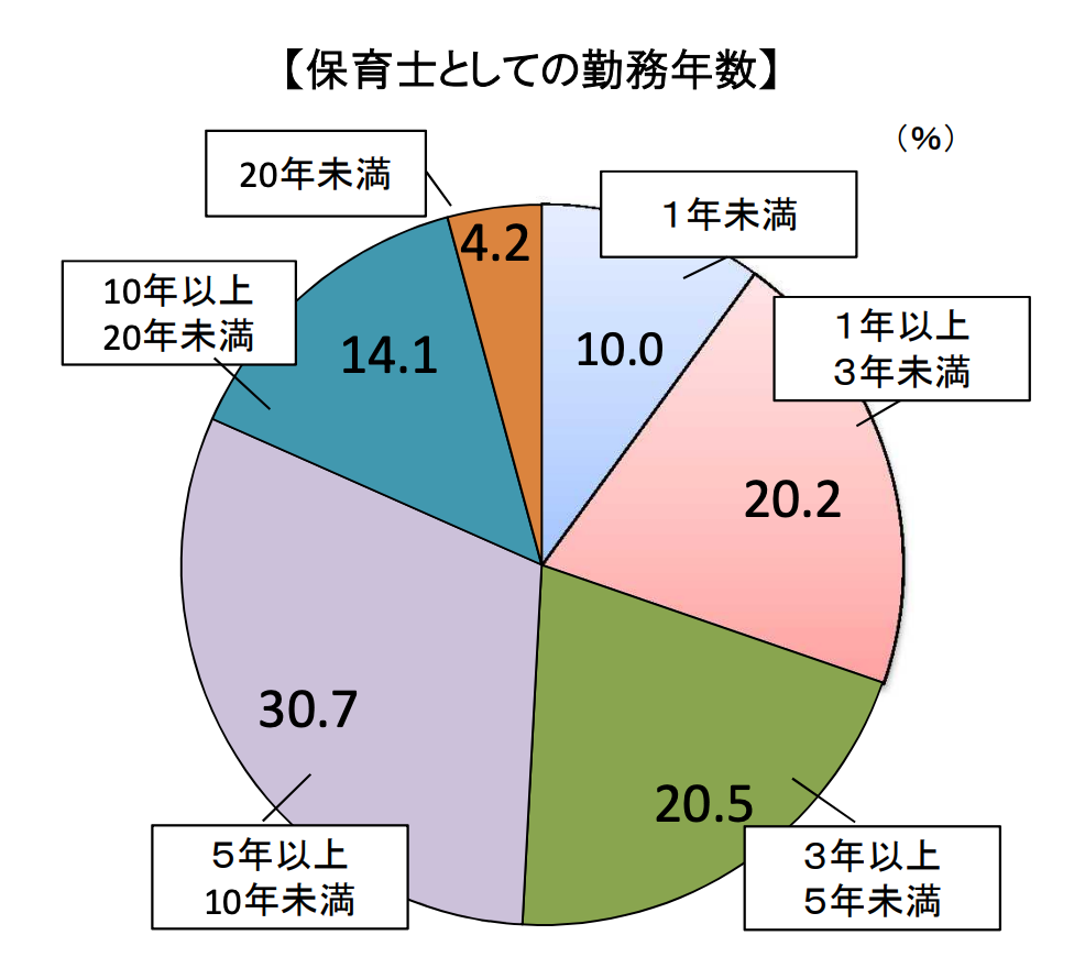 さらに、同調査によるとその就業を希望しない求職者の多くは、保育園での勤務年数が5年に満たず、早い段階で現場を離れてしまう傾向があることが分かっています。