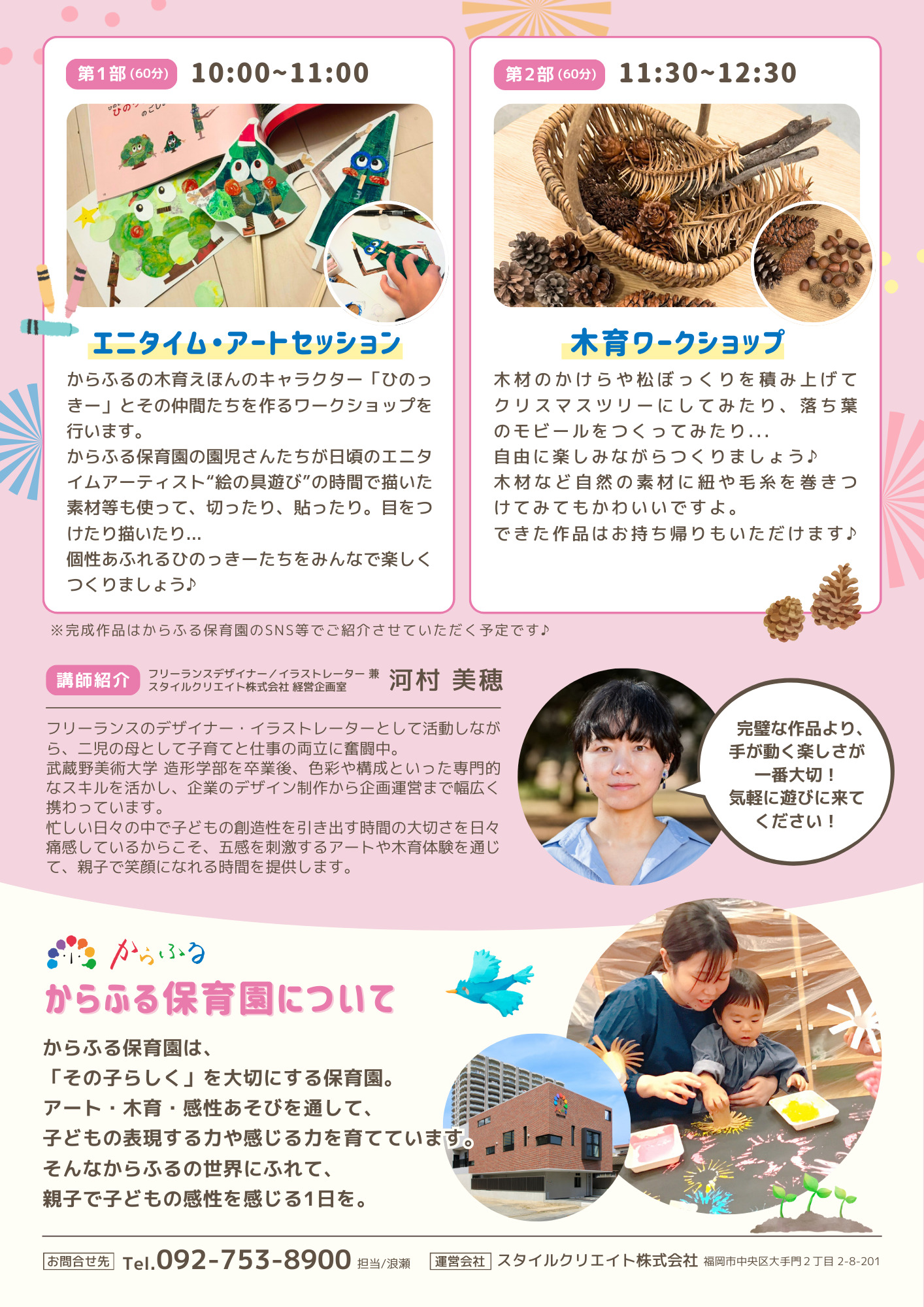 からふるの木育キャラクター「ひのっきー」「くすくすさん」「すぎちゃん」をテーマにした親子アートづくりをご用意しています。
