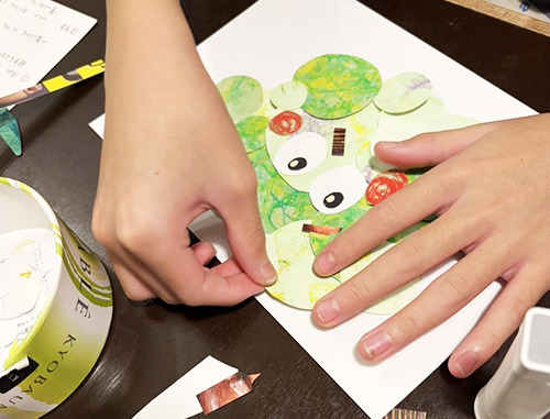 まずは、小さな絵本タイムでひのっきーの世界に触れてから、色や模様がついた紙、葉っぱの形のパーツ、枝をイメージした素材など、さまざまな素材を自由に組み合わせて、“自分だけのひのっきーや仲間たち”をつくるアートに挑戦します。