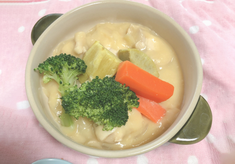 3. 牛乳(または豆乳)で溶いた米粉を少しずつ加え、混ぜながらとろみをつける
